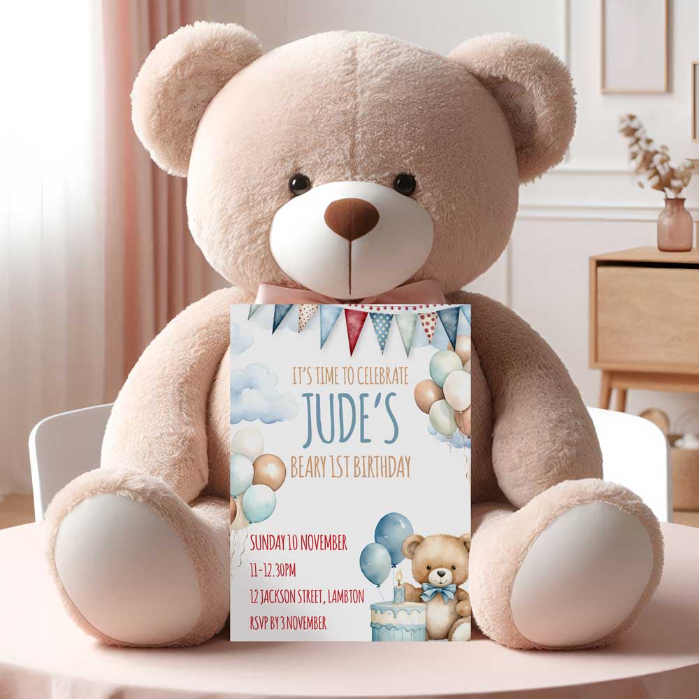 Celebrate your little one’s first birthday with this adorable teddy bear invitation! Featuring a sweet blue teddy sitting beside a cake topped with one candle, it’s the perfect choice for a boy’s first birthday party.