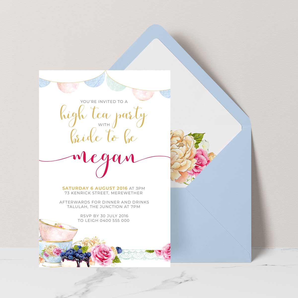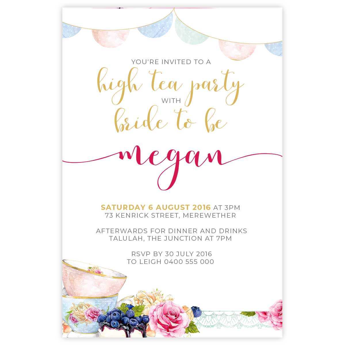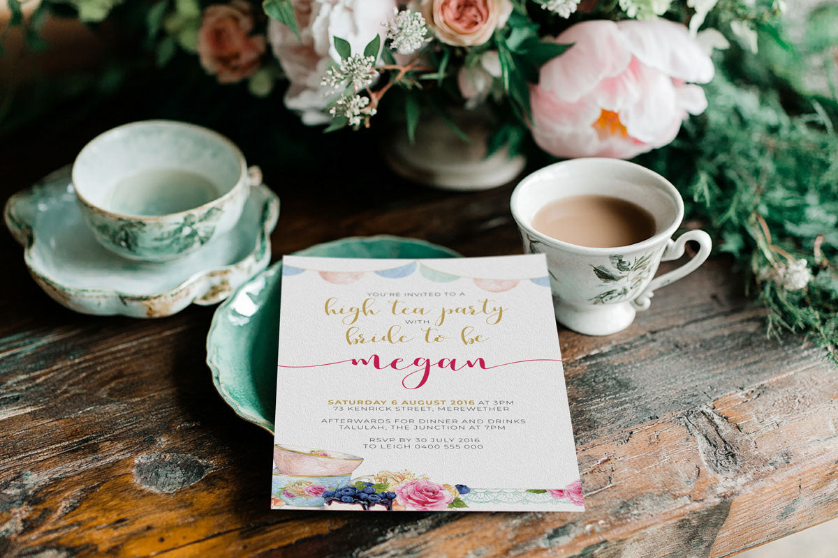 Super sweet High Tea inspired Bridal Shower Invitation featuring watercolour tea cup design with flowers, desserts and bunting flag.