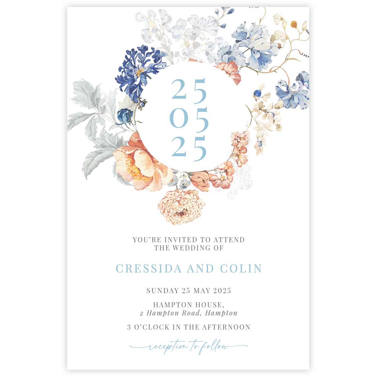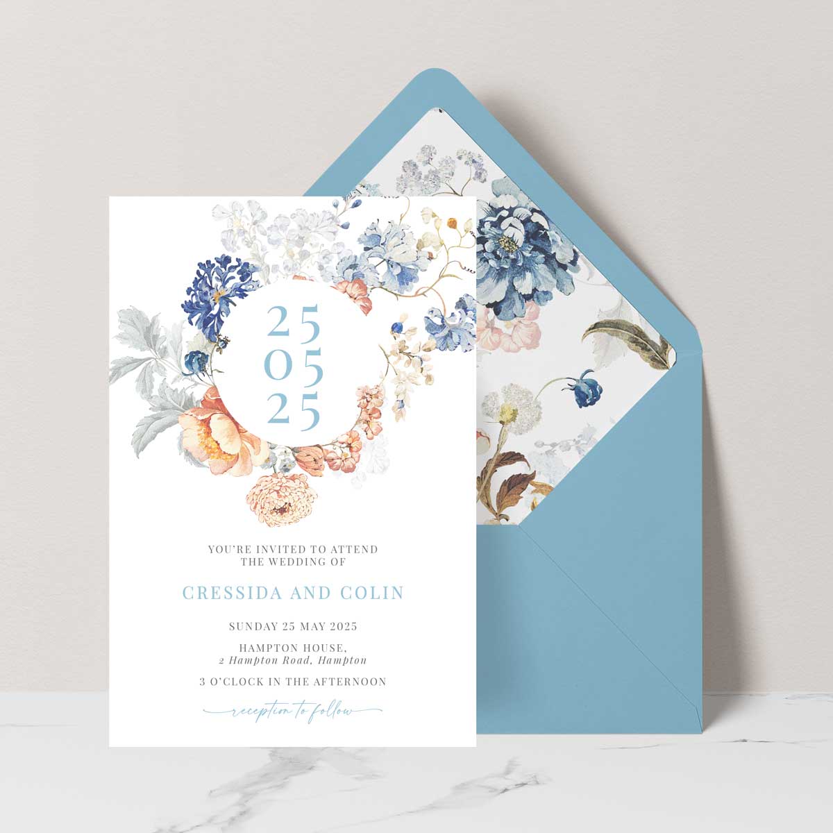Effortlessly elevate your style with this luxurious, vintage-inspired Wedding Invitation from our iconic Bridgerton Lake Collection. Versatile and chic, featuring beautiful blue and peach florals, that can be paired perfectly with white, cream or blue envelopes.