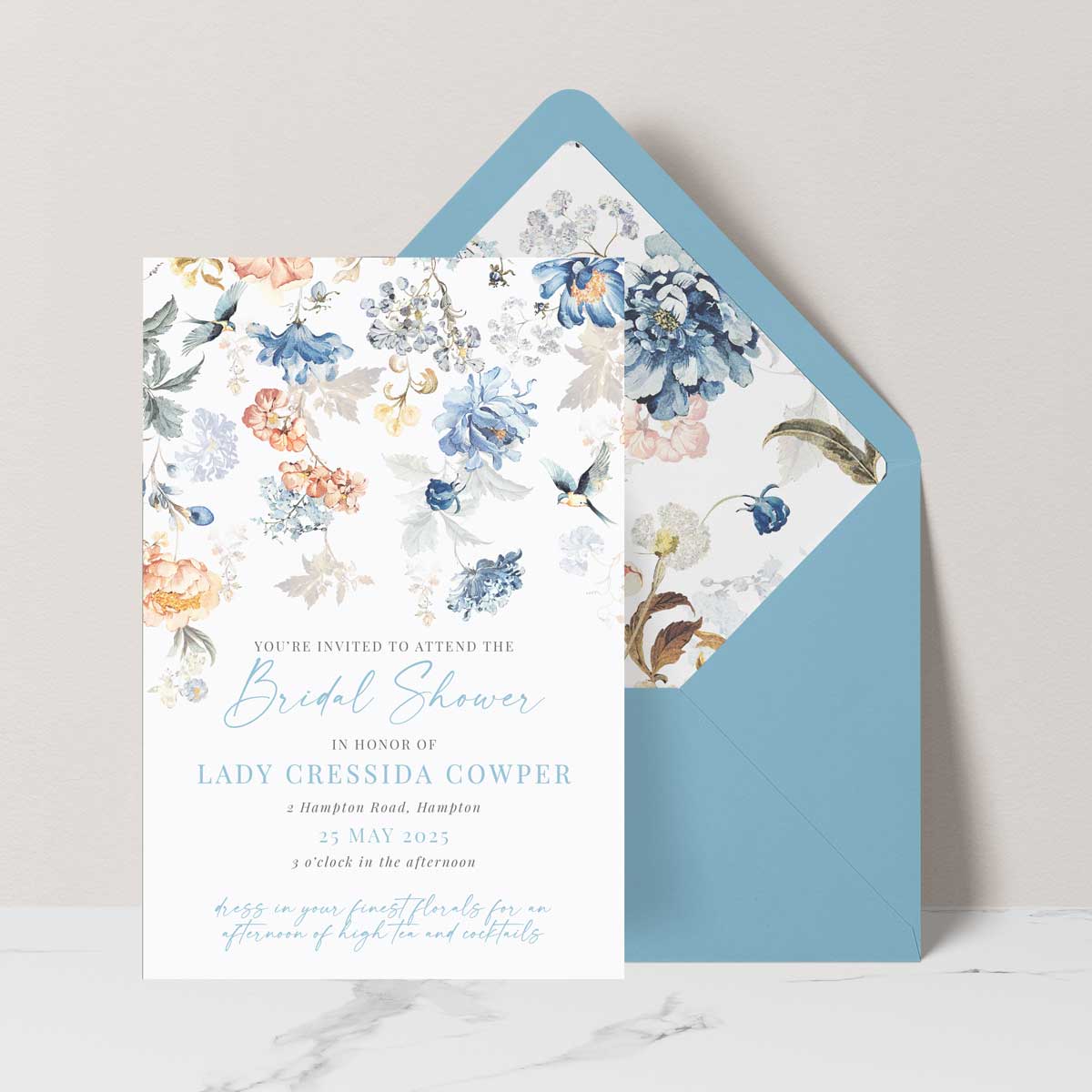 Bridgerton insppired bridal shower invitation with peach and blue florals pattern blue envelope