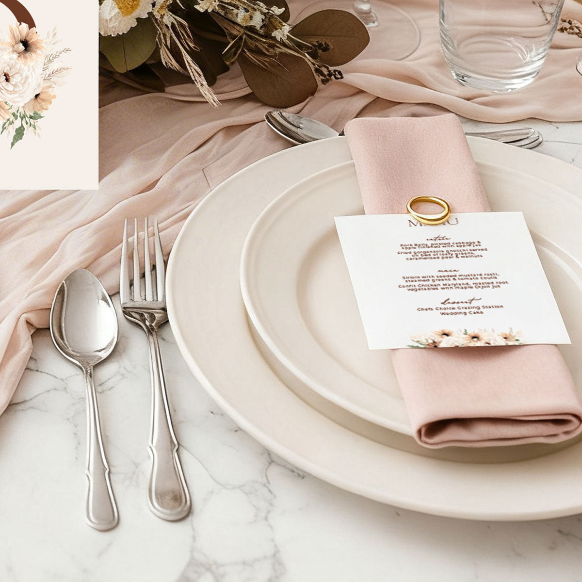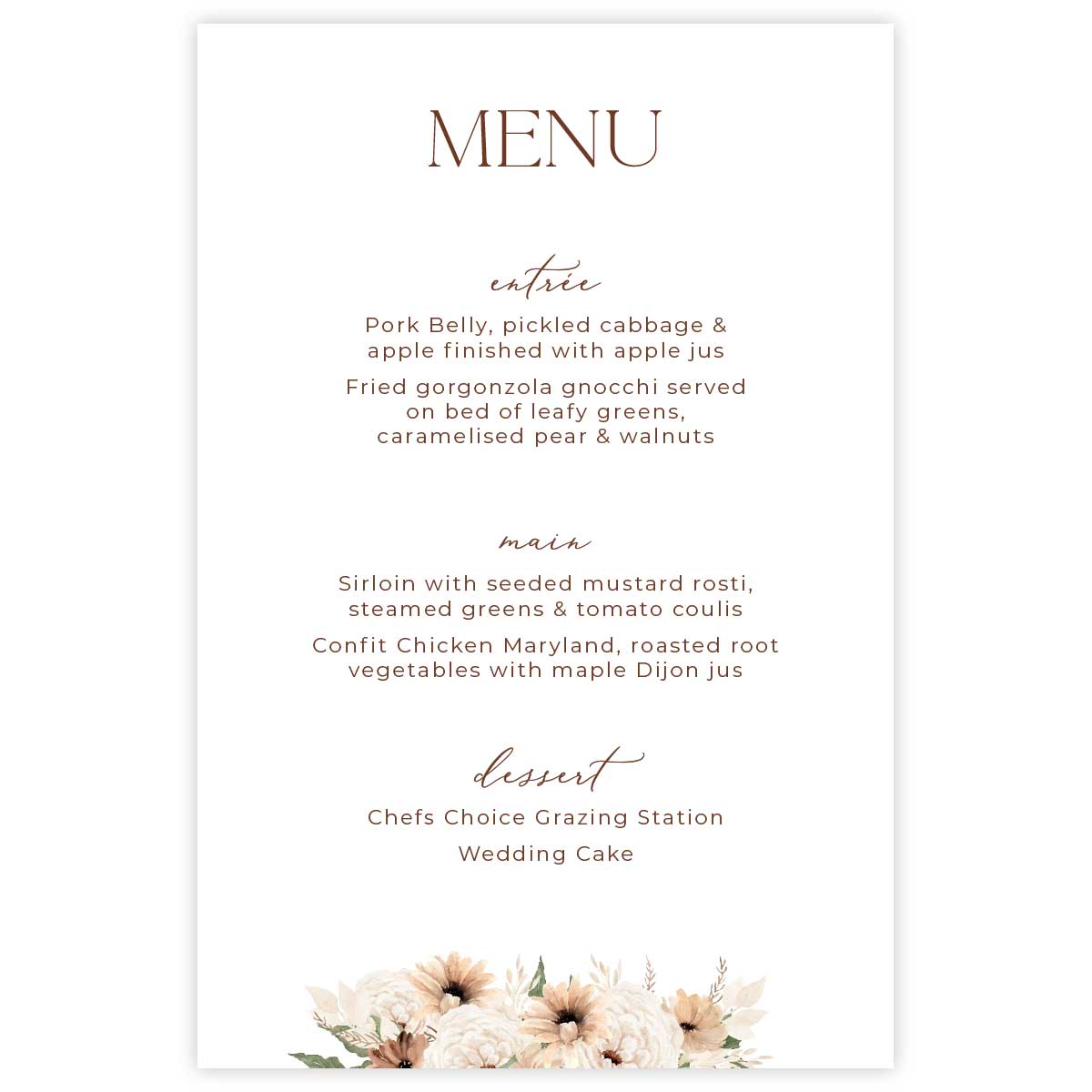 From the Bohemian Elegance Collection, comes this stunning floral bouquet Place Card design of cream and brown florals, dried palms and pampas grass. Perfect for boho, spring or autumn weddings.
