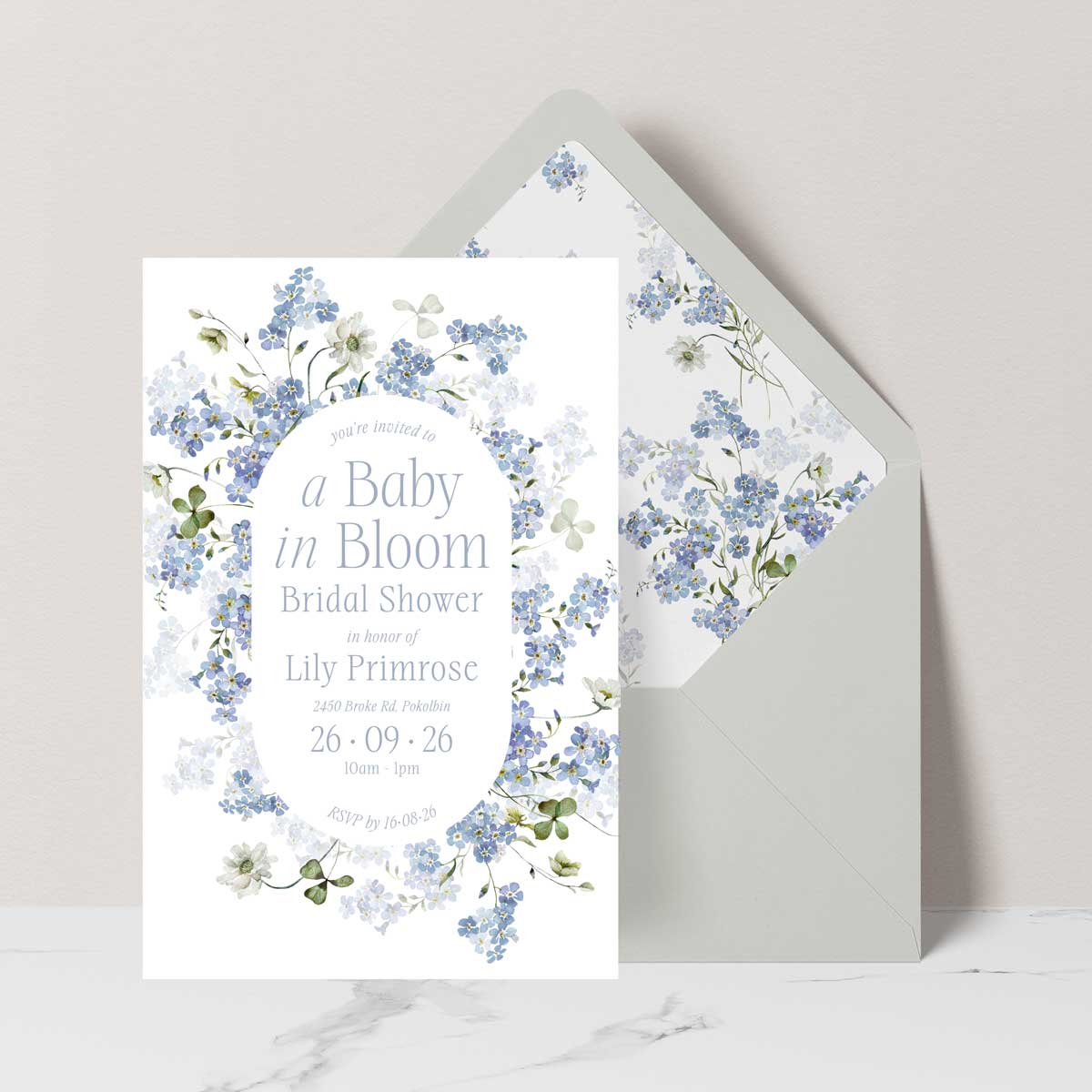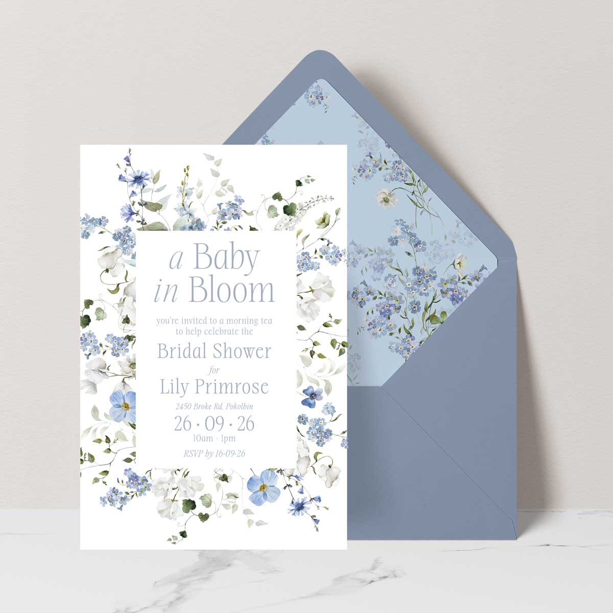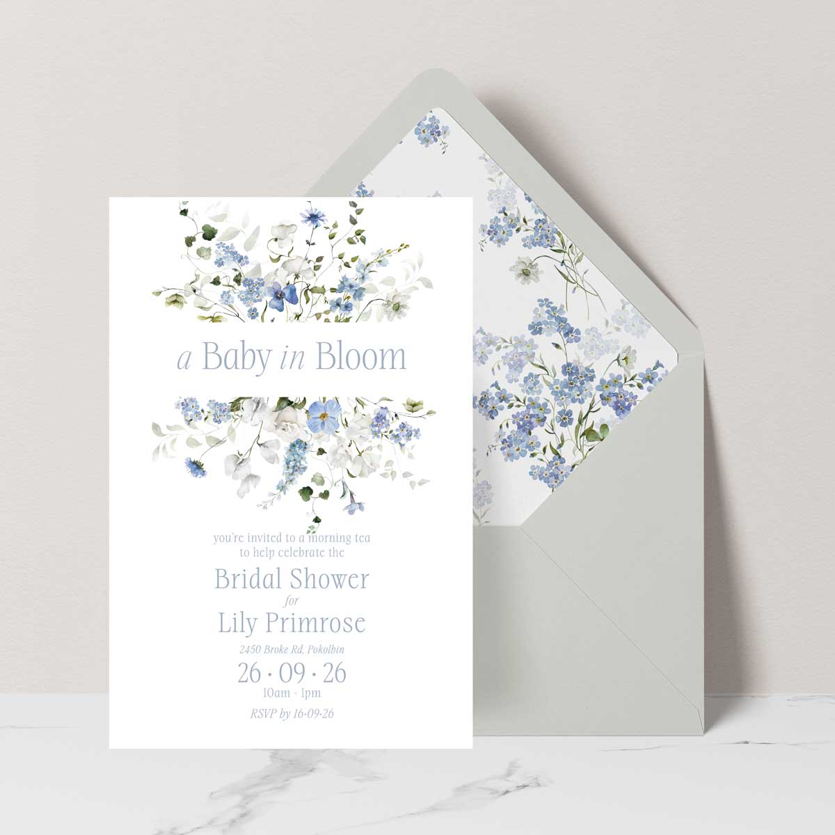 Baby shower invitation with Primrose Spring floral design featuring 'a baby in bloom' dusty blue envelope with floral liner