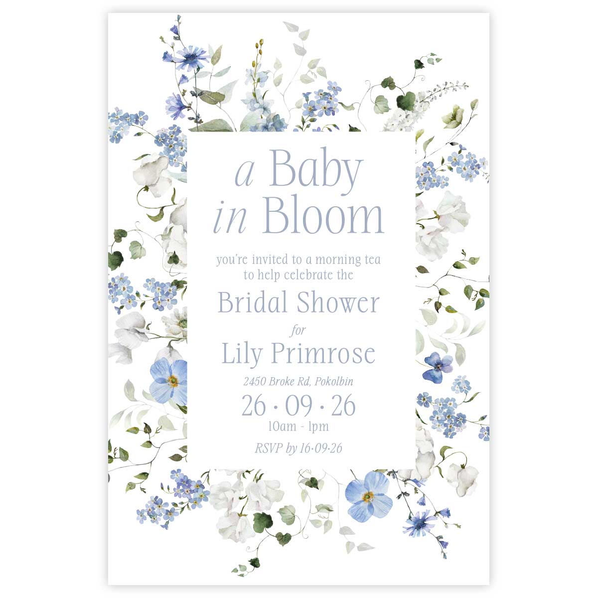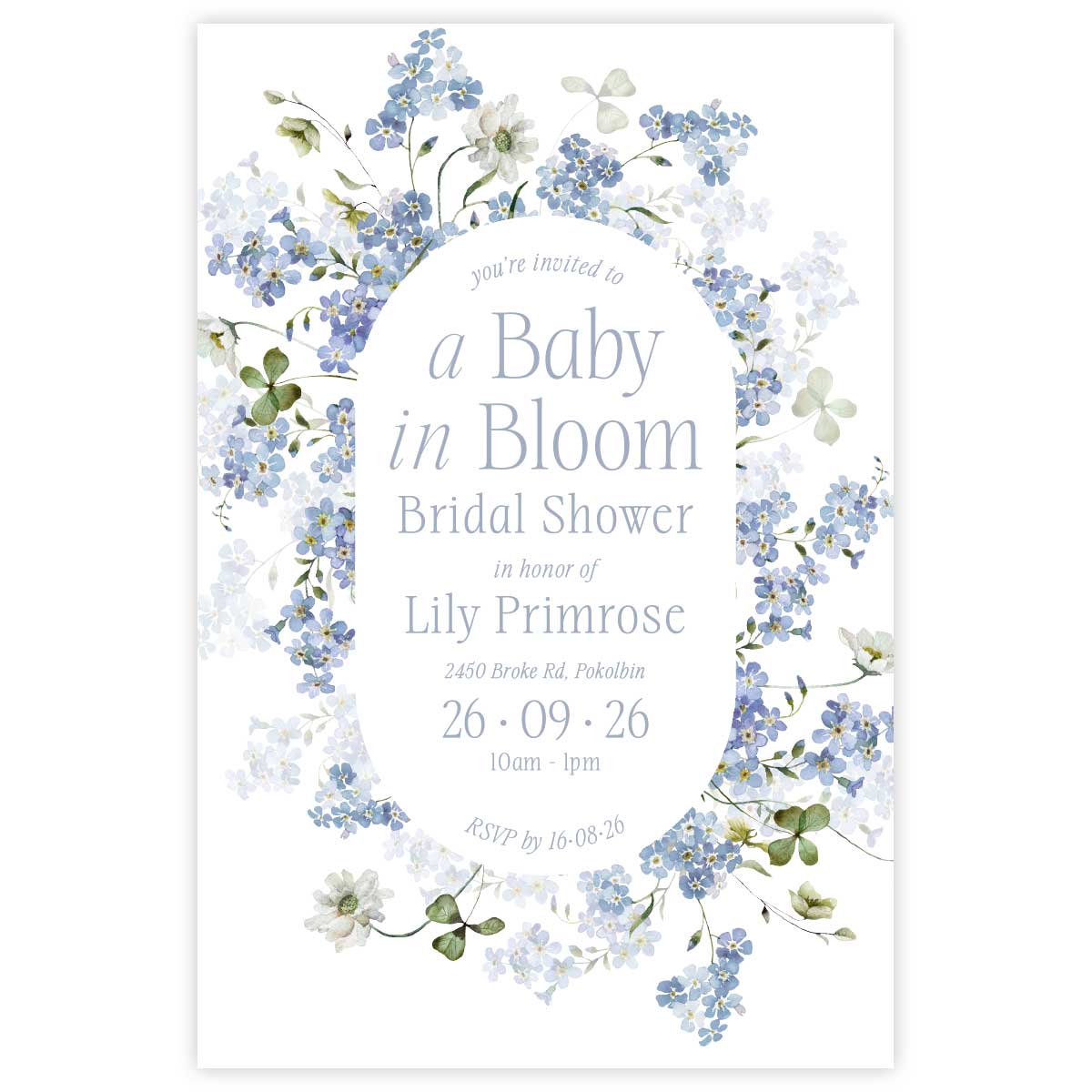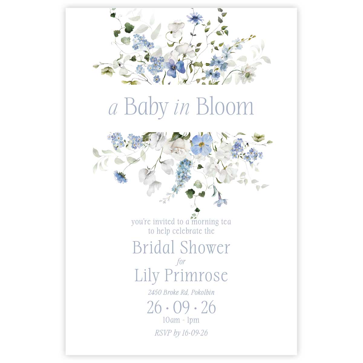 Effortlessly elevate your style with this luxurious, vintage-inspired Baby Shower Invitation from our romantic Primrose Spring Collection. Primrose Spring is a romantic floral invitation suite inspired by the softness of early spring gardens. Delicate hand-painted botanicals in powder blue, soft white and fresh green gently frame the invitation, creating an airy, elegant composition that feels both timeless and light.