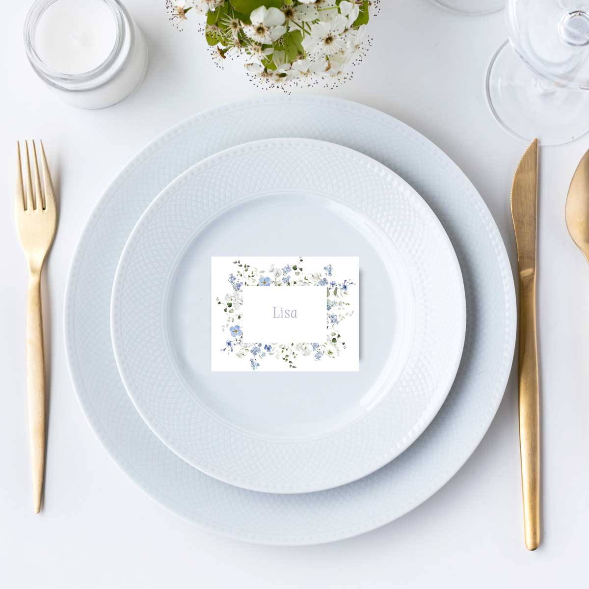 Effortlessly elevate your style with this luxurious, vintage-inspired Place Cards from our iconic Primrose Spring Collection. A romantic floral collection inspired by the softness of early spring gardens. Delicate hand-painted botanicals in powder blue, soft white and fresh green gently frame the invitation, creating an airy, elegant composition that feels both timeless and light.
